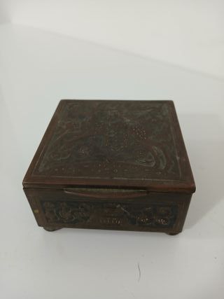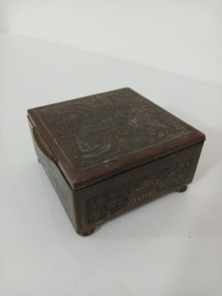 Elegante scatola antica in ottone con decorazioni a sbalzo. - Materiale: ottone. - Decorazioni floreali e figurative. - Base con piedini. Antica Scatola Cofanetto Portagioie Ottone Sbalzato Art Nouveau Primi 900 In buone condizioni generali come da foto