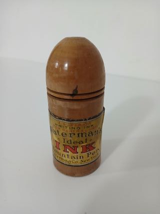 Antico contenitore per inchiostro da viaggio Waterman's. - Etichetta A Superior Writing Ink For General Use. - Modello Ideal Ink. - Prodotto da L.E. Waterman Co., New York. Antico Contenitore Astuccio da Viaggio Inchiostro Waterman's Ideal Ink in Legno in buone condizioni come da foto