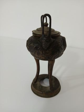 Antico bruciatore di incenso in bronzo con un design a tripode. - Decorato con motivi in rilievo. - Manici laterali. - Coperchio con pomello. Antico Bruciatore di Incenso Incensiere Tripode in Bronzo Asiatico Vintage In buone condizioni come da foto