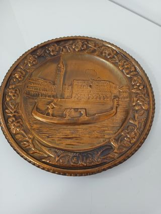 Bellissimo piatto decorativo in rame sbalzato, con un'elegante scena di Venezia. - Raffigurazione di una gondola e palazzi veneziani. - Cornice decorata con fiori. - Stile vintage. Piatto Decorativo in Rame Sbalzato Vintage Venezia Gondola Campanime San Marco In buone condizioni generali come da foto