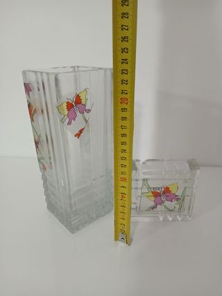 Elegante set composto da un vaso e un posacenere in vetro pressato. - Vaso dalla forma geometrica con decorazioni floreali e farfalle. - Posacenere quadrato coordinato con lo stesso motivo decorativo. Set Vaso Geometrico e Posacenere in Vetro Pressato Decorazione Farfalle Vintage come nuovo