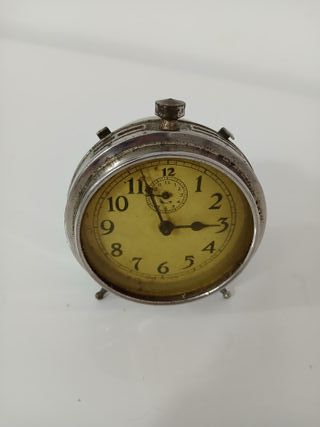 Bellissima sveglia antica da tavolo, un pezzo vintage con una cassa in metallo. - Design classico. - Quadrante giallo con numeri neri. - Lancette delle ore e dei minuti. - Piccolo quadrante secondario per sveglia. Antica Sveglia Orologio da Tavolo Vintage in Metallo Made in Italy in condizioni come da foto, non funzionante