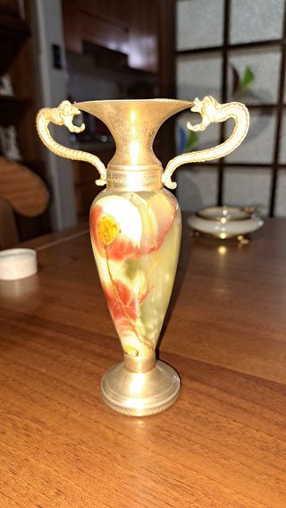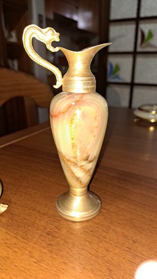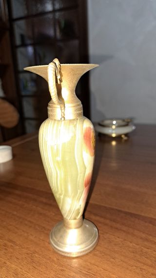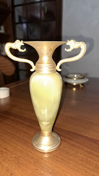 Elegante vasetto in onice con dettagli in metallo dorato. - Materiale: Onice e metallo. - Design unico con manico.