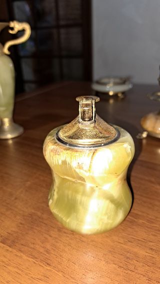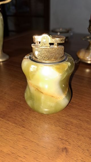 Elegante accendino da tavolo con base in onice. Un pezzo d'arredo unico. - Base in onice verde e bianca con venature. - Meccanismo dorato.