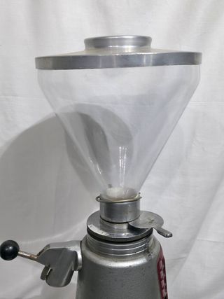 Macinino da caffè vintage MAZZER modello MAC 38, risalente al 1965. Un pezzo da collezione per gli amanti del caffè. - Design classico in metallo e plastica trasparente. - Leva laterale per la regolazione della macinatura.