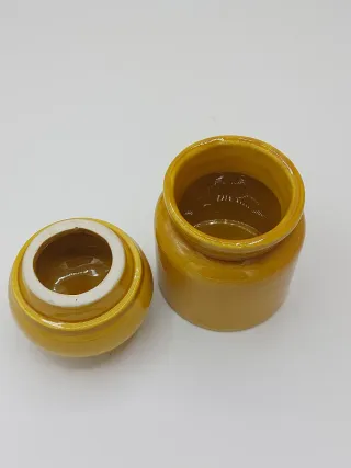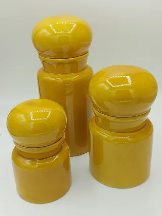 Set di tre barattoli vintage in ceramica color giallo ocra. Perfetti per aggiungere un tocco retrò alla tua cucina o come elementi decorativi. - Tre barattoli di diverse dimensioni. - Finitura lucida. - Design classico con coperchio sferico - piccolo: h 14cm, d 9 cm -medio: h 18 cm, d 10 cm -grande: h 24 cm, d 10 cm.