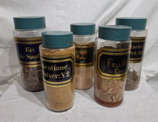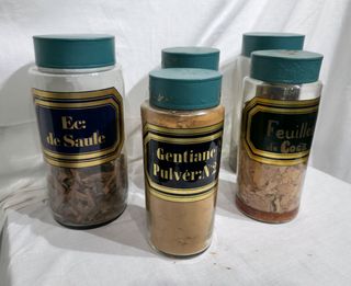 Lotto di 5 grandi barattoli da Farmacia-Erboristeria di fine 1800 di provenienza Francese. Estratto di salice, usato per le sue proprietà analgesiche e antinfiammatorie. Polvere di radice di genziana, utilizzata come digestivo e tonico. Foglie di coca, note per le proprietà stimolanti. Polvere di tripoli, materiale siliceo usato storicamente come abrasivo per la pulizia e lucidatura. Radice di agrifoglio, utilizzate per infusi o decotti con proprietà anti febbrili. Misure: i 2 più grandi altezza 29 cm e 12,5 cm di diametro- 3 più piccoli 27 cm e 10,5 cm di diametro. Le foto fanno parte della descrizione Tutto sarà spedito con la