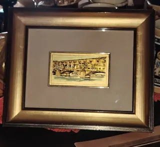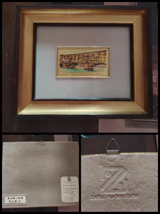 Cromolitografia d’Arte su Foglia Oro 23 kt,Ponte Vecchio,Firenze Romagnoli ‘65.Proposta di pregio per amanti dell’arte e del collezionismo:raffinata cromolitografia a tiratura limitata,realizzata artigianalmente con torchio a mano su autentica foglia d’oro 23 carati,capace di donare luce e profondità all’immagine. Soggetto:il celebre Ponte Vecchio di Firenze,icona intramontabile di storia e romanticismo,impreziosito da delicati riflessi dorati che ne esaltano l’atmosfera senza tempo.Firmata: Romagnoli ‘65 Autenticità:marchio originale Zeto Studio d’Arte sul retro con certificato di garanzia.Cornice :struttura in legno con raffinata