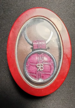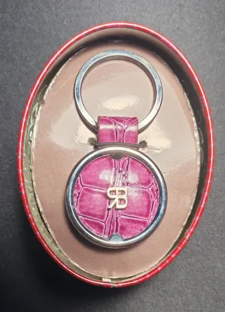 Portachiavi firmato Renato Balestra con un design elegante e raffinato. - Finitura in ecopelle effetto coccodrillo. - Colore fucsia vivace. - Logo RB in metallo. - Anello portachiavi in metallo argentato.