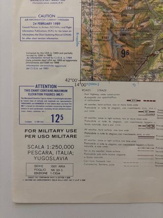 Mappa militare SCALA 1:250,000 Pescara, Italia; Yugoslavia. - Serie 1501 ARIA, Foglio NK 33-5. - Edizione 1-CIGA. - Contiene cifre massime di elevazione (MEF). - Informazioni aeronautiche aggiornate al 24 febbraio 1989. Disponibili altre città italiane, info in chat