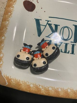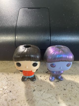 Due Funko Pop di Stranger Things, provenienti da Kinder Joy. Un pezzo da collezione unico. - Personaggio 1: Capelli scuri, maglia rossa e pantaloncini blu. - Personaggio 2: Capelli e corpo viola iridescente.