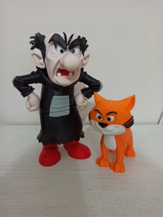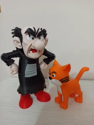 Coppia di personaggi di Gargamella e Birba realizzati in stampa 3D. - Gargamella indossa un abito nero con dettagli grigi e scarpe rosse. - Birba è un gatto arancione con dettagli neri e bianchi.