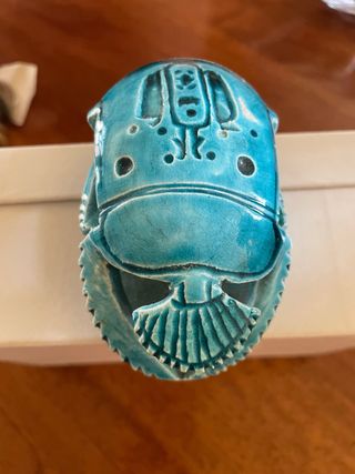 Bellissimo scarabeo portafortuna in stile egiziano, realizzato in ceramica smaltata di un vivace colore blu. - Design dettagliato che richiama l'iconografia egizia. - Smalto lucido e brillante. - Oggetto decorativo unico.