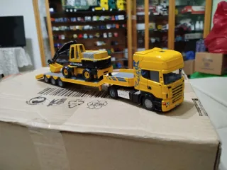 Modellino di camion Scania r 620 con gondola ed escavatore giallo scala 1/50 marca siku no ELIGOR ixo altaya joal wsi tekhno conrad ideale per collezionisti e diorami - Camion di colore giallo e nero. - Rimorchio pianale - Escavadora gialla con braccio mobile.