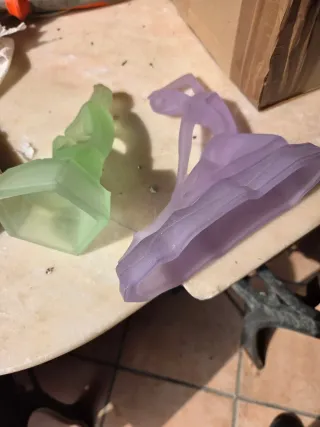 Due splendidi oggetti ornamentali in vetro, uno verde e uno viola, con forme eleganti. - Materiale: Vetro. - Colori: Verde e viola. - Design: Figure stilizzate.