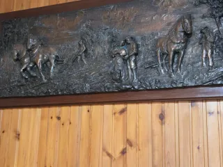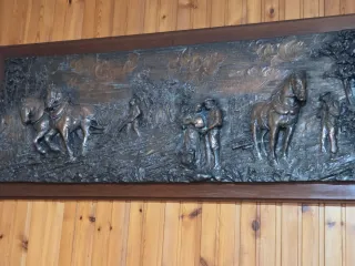 Bellissimo quadro in lamina di bronzo, raffigurante una scena rurale con cavalli e persone al lavoro. - Materiale: lamina di bronzo. - Soggetto: scena di vita contadina.