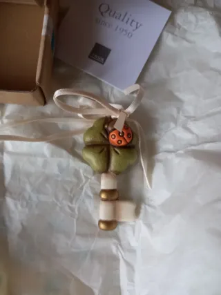Deliziosa chiave portafortuna Thun, perfetta per portare un tocco di allegria. - Design a forma di quadrifoglio con coccinella. - Dettagli in oro e bianco sulla base. - Realizzata in ceramica. - Completa di nastro per appenderla. Con scatola e busta originale e certificato di garanzia