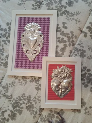 Quadretti con decorazione a forma di cuore sacro, stile ex voto. Exvoto de lamina de aluminio. - Decorazione a forma di cuore. - Finitura metallica argentata. - Vari sfondi personalizzabili - Cornice bianca - Dimensione 30x20 e 15x20 PREZZO 30x20 = 40 euro PREZZO 15X20 = 25 euro