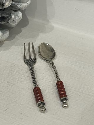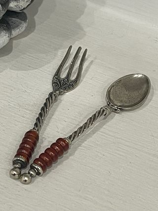 Set di miniatura composto da una forchetta e un cucchiaio. - Realizzati in argento. - Manici decorati con perline rosse in legno e dettagli a spirale.
