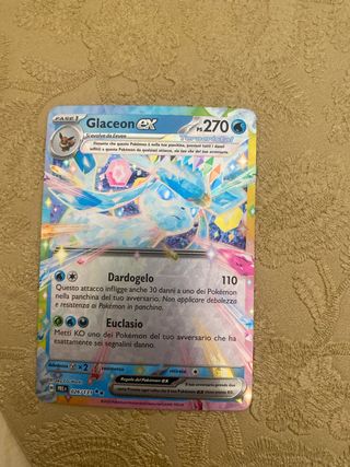 Carta Pokémon Glaceon EX, Fase 1. - Attacco Dardogelo infligge 110 danni. - Attacco Euclasio mette KO Pokémon avversario con sei segnalini danno. - PS 270. - Teracristal.
