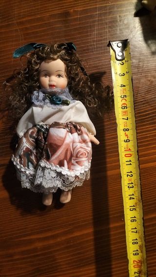 Deliziosa bambola in porcellana, perfetta per collezionisti o come elemento decorativo. - Dettagli in pizzo sul vestito. - Capelli ricci e castani.