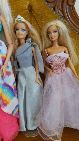 Lotto composto da 8 bambole Mattel, tra cui una sirena. - Bambola con capelli rosa e abito arcobaleno - Bambola con abito rosa e corona - Bambola con abito viola - Bambola con abito rosa - Bambola con abito arcobaleno - Bambola sirena con capelli blu - Bambola con abito grigio - Bambola con abito rosa chiaro