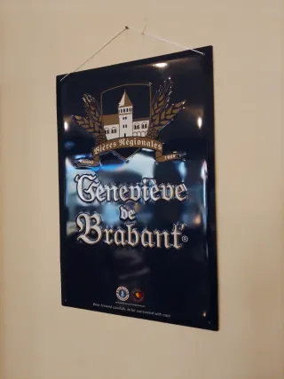 Targa pubblicitaria in metallo per la birra Geneviève de Brabant.Caratteri in rilievo,misure 40x60 cm - Design vintage con stemma e spighe di grano. - Scritta Bières Régionales e anno 1909. - Colore blu scuro con dettagli dorati e argentati.