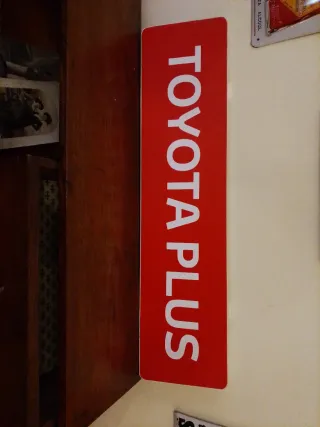 Cartello pubblicitario Toyota Plus con sfondo rosso e scritte bianche. 55x13 cm in plexiglass - Design verticale. - Scritta Toyota Plus in rilievo.