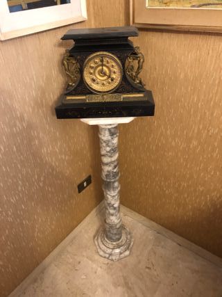 Elegante orologio da tavolo in stile antico, perfetto per aggiungere un tocco di classe a qualsiasi ambiente.L'orologio presenta una cassa scura con dettagli dorati e figure decorative. - Cassa in metallo scuro con finiture dorate. - Quadrante rotondo con numeri romani. - Base in marmo bianco e grigio. - Colonna in marmo scanalata.