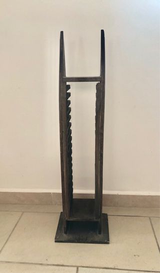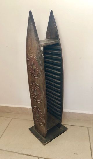 Elegante porta CD dal design etnico, realizzato in legno. - Decorazioni circolari intagliate. - Struttura a più ripiani per CD. - Altezza 80cm