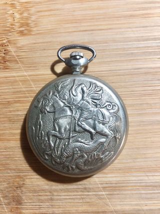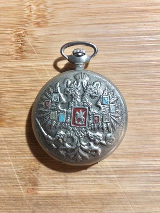 Orologio da tasca sovietico Molnija, caratterizzato da un'incisione dell'aquila bicipite e di San Giorgio. Prodotto dall'azienda russa Molnija, con sede a Čeljabinsk. Il design presenta l'aquila bicipite e San Giorgio, simboli storici russi. NON FUNZIONA DA REVISIONARE