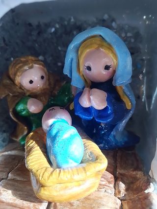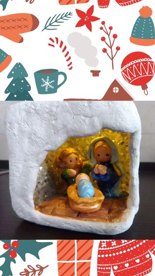 Casetta natalizia realizzata a mano, il tetto si apre e all' interno c'è una lucina che illumina l' Interno. Le statuine sono fatte artigianalmente e dipinte a mano