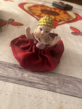 Bellissima bambola vintage in porcellana, con vestito rosso e cappellino decorato. Perfetta per collezionisti o amanti del vintage. - Realizzata in porcellana. - Vestitino rosso in tessuto satinato. - Cappellino giallo e verde decorato.