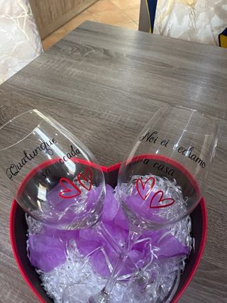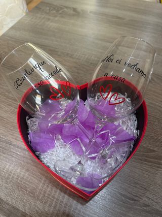 Set di due calici in vetro, perfetti per San Valentino o come regalo speciale. Presentati in una scatola a forma di cuore. - Calici personalizzati con scritte e cuori rossi. - Scatola regalo a forma di cuore inclusa.