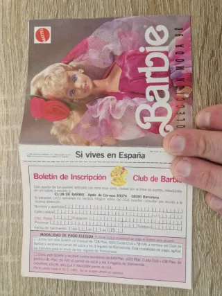 Antico catalogo per l'iscrizione al Club Barbie Spagna, relativo alla collezione moda 1990. Include modulo da compilare, informazioni su quote e regali di benvenuto. Offerta valida fino al 31/1/1997.