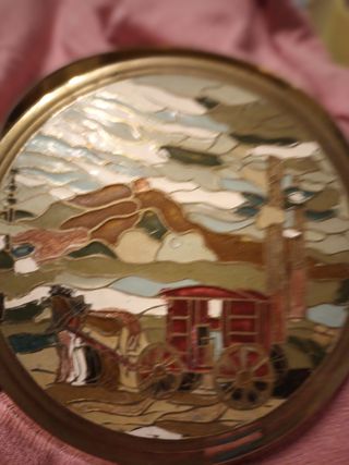 Scatola in ottone pesante quasi 400 grammi. Tonda diametro 12 cm. Altezza 5 cm,con paesaggio e carrozza a cavalli in preziosi smalti. Molto vintage. Presenta alcune piccole macchie proprie del vecchio ottone all'interno. Grazie
