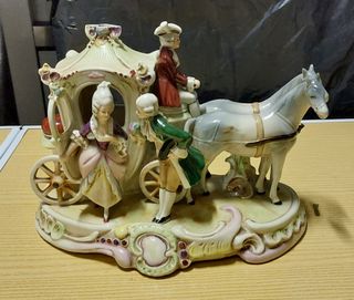 Splendida carrozza in porcellana di Luigi Fabris, risalente agli anni '40. Un pezzo d'antiquariato finemente lavorato. - Decorata con fiori colorati e dettagli dorati - Due cavalli bianchi trainano la carrozza - Figura di un personaggio con abiti d'epoca - Dimensioni: L 19 x H 8 x P 6cm La porcellana presenta un'imperfezione sul tetto della carrozza; vedi foto.