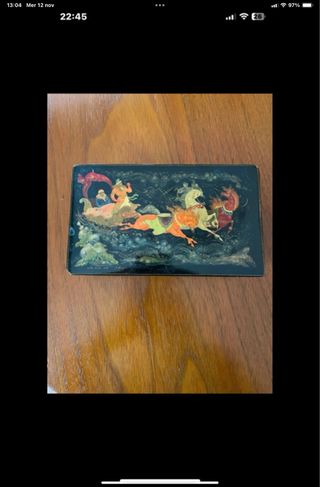 Elegante scatola porta oggetti realizzata in lacca russa, con una vivace scena dipinta a mano. - Decorazione con scena di cavalli e figure firmata e datata 1967 - Finitura lucida e dettagliata. - Perfetta per conservare piccoli oggetti. la scatola è in ottime condizioni se si eccettua un piccolo danno al coperchio invisibile quando la scatola è chiusa ( vedi foto )