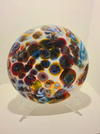 Bellissimo piatto decorativo in vetro soffiato con un design vibrante e colorato. - Vetro soffiato artistico. - Motivo a bolle multicolori. - Base trasparente. Misura cm 23 x 6