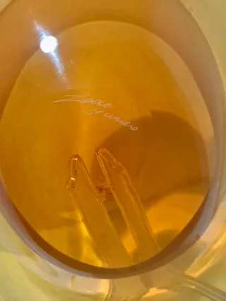 Vaso in vetro di Murano con bollicine e dettagli dorati. - Design unico con inclusioni dorate. - Finitura trasparente con bolle d'aria. - Base in vetro nero lucido. L'oggetto e' mancante delle dita come puoi vedere in foto. Firmato alla base Misura cm 33 x 22