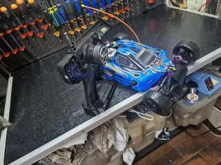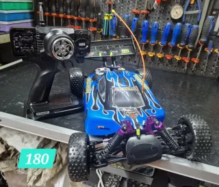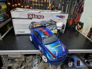 Modellino di auto radiocomandata Amax Hobby. - Scala 1/10. - Modello Rusa. - Colore blu con grafiche rosse e gialle. - Telecomando incluso.