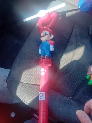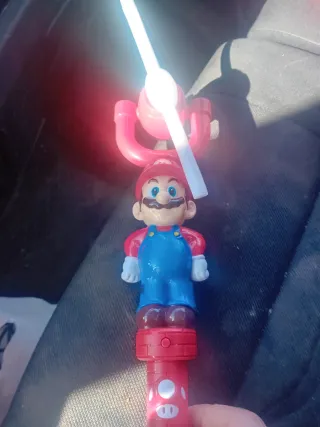 Giocattolo a tema Super Mario Bros. con personaggio di Mario. - Personaggio di Mario in posa. - Base a forma di tubo rosso con simboli. - Pale rosse e bianche in cima.