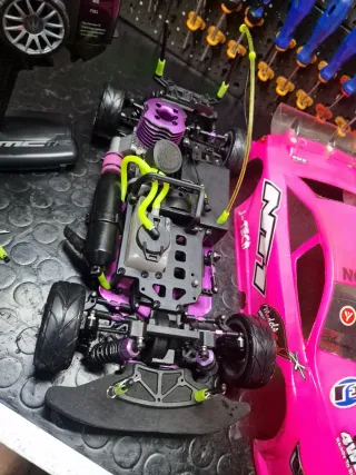 Modello di auto radiocomandata a scoppio, con carrozzeria rosa. - Carrozzeria rosa con grafiche. - Telecomando Maserati. - Motore a scoppio viola.
