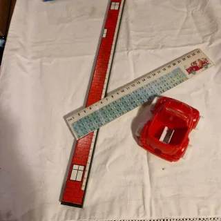 Lotto di cancelleria vintage che include un temperino rosso e un righello trasparente con tabelle. - Temperino rosso a forma di macchinina. -2 Righelli . Quello verde con scale in centimetri e tabelle di moltiplicazione.