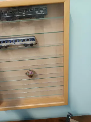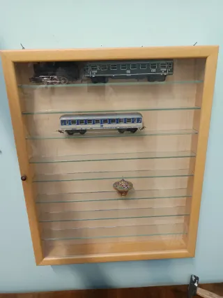 Vetrina con finitura colore naturale, ideale per esporre oggetti. - Struttura in legno. - Ripiani in vetro.