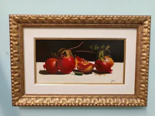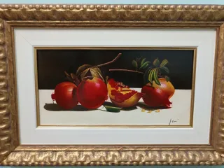 Bellissimo dipinto ad olio su tavola raffigurante una natura morta con melograni. - Tecnica: Olio su tavola. - Soggetto: Natura morta con melograni. - Cornice dorata inclusa.