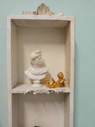 Elegante scaffale espositore da parete, perfetto per esporre oggetti decorativi. - Struttura in legno bianco anticato. - Design a tre ripiani. - Decorazioni floreali intagliate.