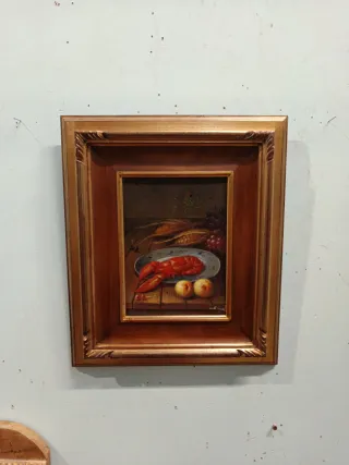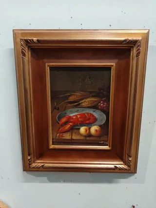 Dipinto a olio raffigurante una natura morta con aragosta, frutta e uva. - Tecnica: Olio su tavola. - Soggetto: Natura morta.