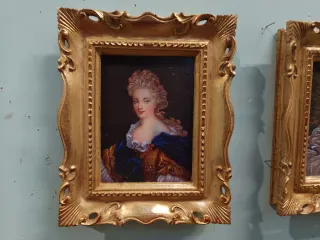 Coppia di dipinti in miniatura con cornici dorate. - Raffigurano ritratti di donne in abiti d'epoca. - Cornici ornate con dettagli lavorati.