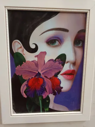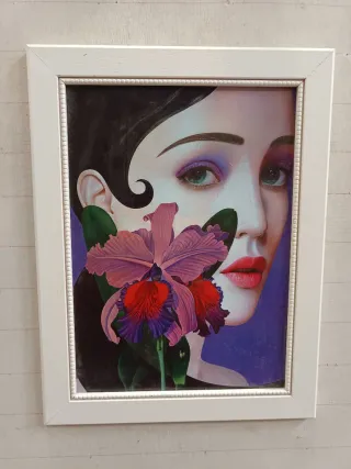 Quadro decorativo con ritratto di donna e fiore. - Stile artistico. - Colori vivaci. - Cornice inclusa.